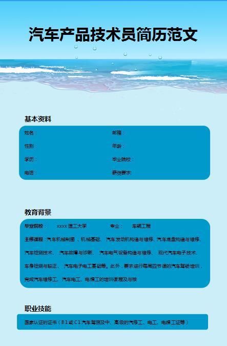 汽修,技术员,机械,维修,汽车产品技术员简历模板适用于汽车专业相关岗位求职参考使用 简历模板 个人简历模板本作品提供DOC格式文件可免费下载!, 别具一格的汽车产品技术员简历模板 的本展示图片均为真实Word截图,所见即所得,本简历模板免费简洁,适合用于制作各类特色中文简历,如:汽修,技术员,机械,维修等。.doc格式。