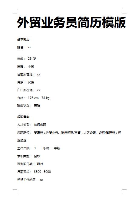 外贸,业务员,外语专业,金融专业,外贸业务员简历模板适用于语言,金融类岗位求职设计应用!, 精美的外贸业务员简历模板 的本展示图片均为真实Word截图,所见即所得,本简历模板免费简洁,适合用于制作各类特色中文简历,如:外贸,业务员,外语专业,金融专业等。.doc格式。